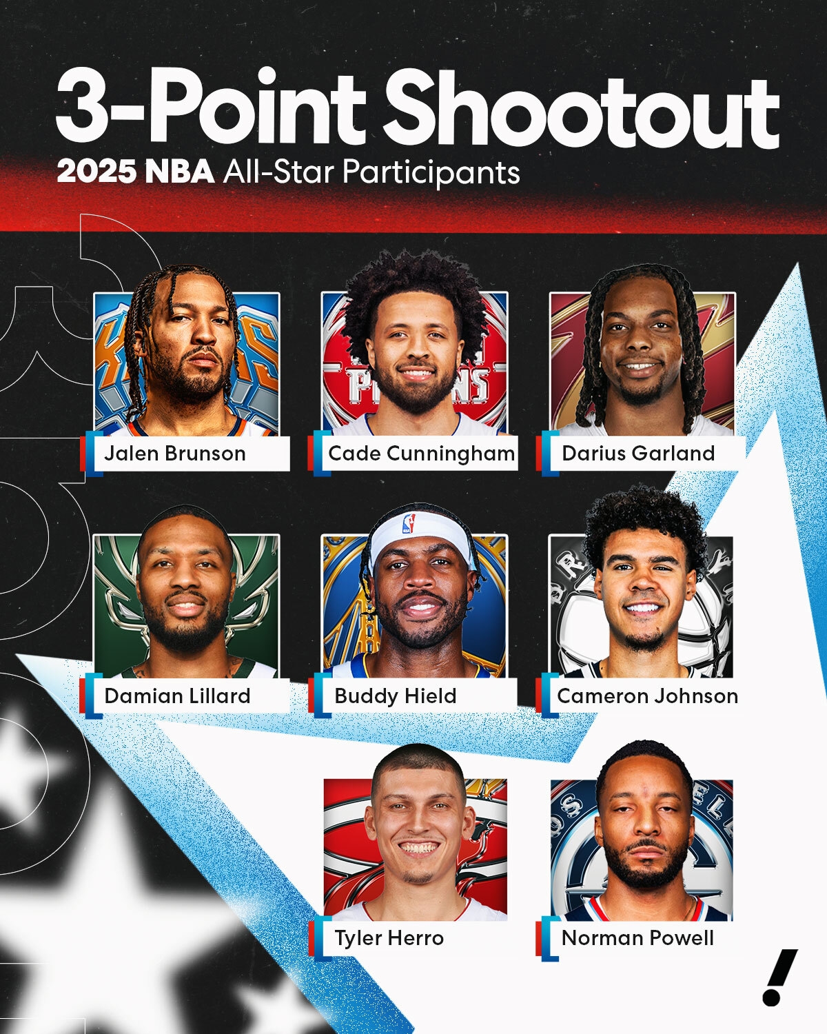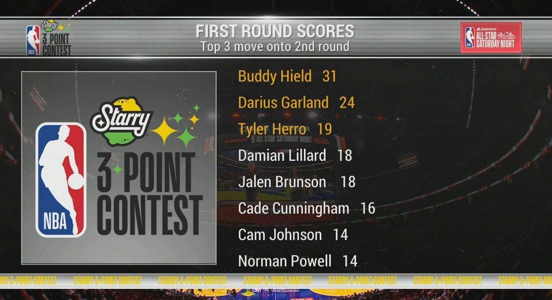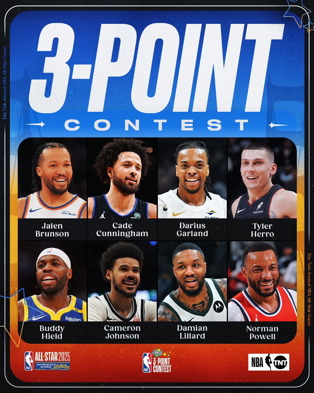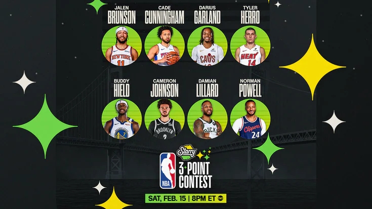 02月16日訊 NBA2025年舊金山全明星周末三分大賽在大通中心進(jìn)行,參賽球員:布倫森(尼克斯)、凱德-康寧漢姆(活塞)、加蘭(騎士)、利拉德(雄鹿)、希爾德(勇士)、卡梅隆-約翰遜(籃網(wǎng))、希羅(熱火)和諾曼-鮑威爾(快船)!
