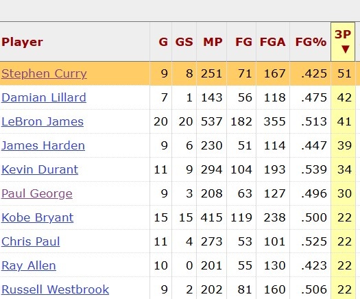 ?庫里全明星生涯共命中51記三分 NBA歷史第一&老詹排名第三