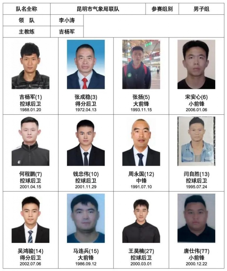 昆明市氣象局聯(lián)隊成立于2004年,主要由昆明市氣象局聯(lián)合各大企事業(yè)單位籃球愛好者組成。球隊注重團隊合作和個人技術(shù)的提高,定期組織訓練,始終秉承“快樂籃球、青春永駐”的宗旨進行鍛煉及比賽。球隊敢于挑戰(zhàn)、勇于創(chuàng)新,無論面對何種困難,都能夠緊密協(xié)作、克服困難、奮力拼搏?,技術(shù)風格上靈活多變。通過積極的參加訓練和比賽,享受籃球帶來的快樂。