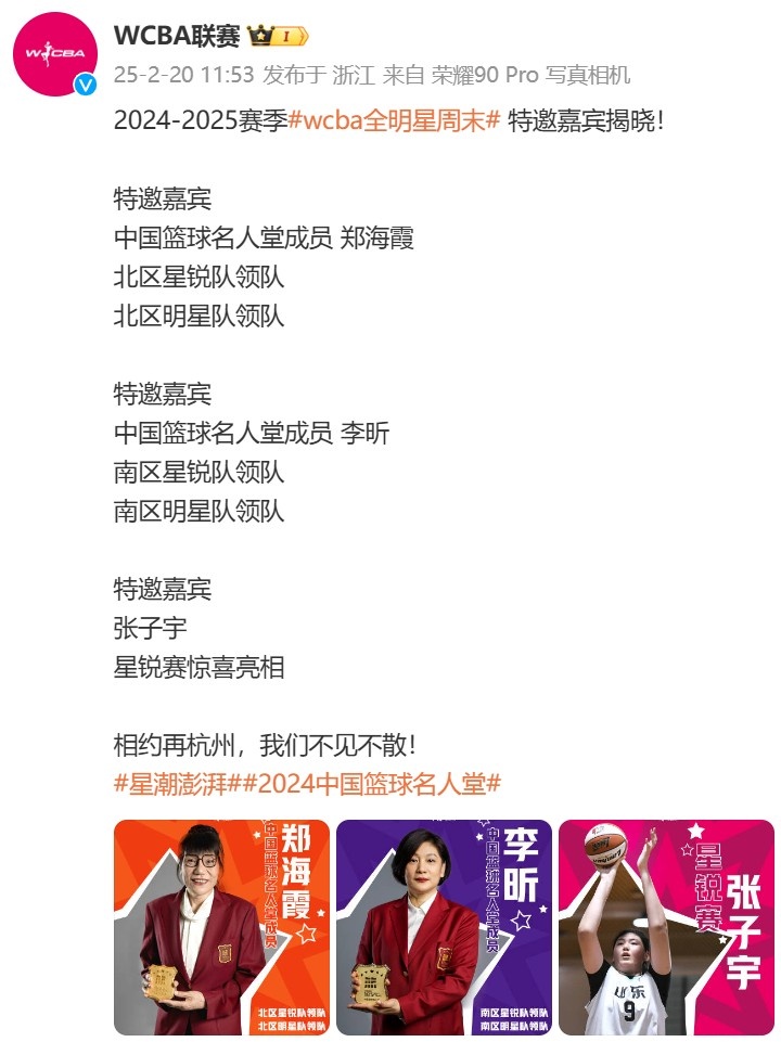 2月20日訊 本周末,本賽季的WCBA全明星賽將會在杭州黃龍?bào)w育中心舉行。WCBA聯(lián)賽官方微博發(fā)文公布了三位特邀嘉賓,分別是鄭海霞、李昕和張子宇,原文如下: 標(biāo)簽: CBA 中國籃球 籃球 WCBA