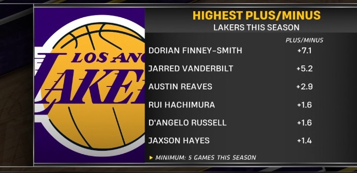 賽前轉(zhuǎn)播方曬出數(shù)據(jù),本賽季至今湖人隊(duì)內(nèi)場(chǎng)均正負(fù)值排行榜如下: