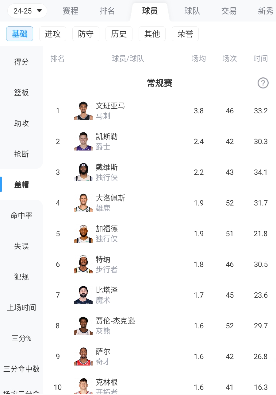 本賽季,文班亞馬代表馬刺出戰(zhàn)46場常規(guī)賽,場均貢獻(xiàn)24.3分11籃板3.7助攻1.1搶斷3.8蓋帽。在蓋帽一項(xiàng)數(shù)據(jù)當(dāng)中,文班斷檔領(lǐng)先第二名的爵士球員凱斯勒。