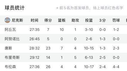 三節(jié)結(jié)束時(shí),尼克斯落后31分,末節(jié)錫伯杜沒再讓先發(fā)球員登場,首發(fā)五虎的出場時(shí)間都在20+。
