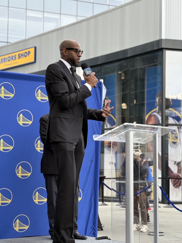 我非常自豪能在這里,參與這個儀式,也很高興看到你的名字和榮譽將永遠銘刻在勇士的歷史中。在這個球館里,在我們都離開之后,你的名字依然會留存下來,你的球衣會高掛在球館上方。所以,謝謝你為球隊所做的一切!