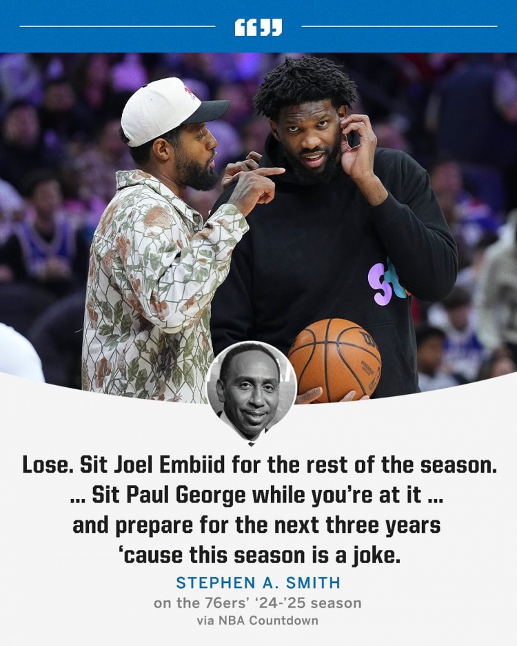 2月24日訊 今日名嘴A-史密斯在《NBA Countdown》節(jié)目中談到了本賽季的76人。
