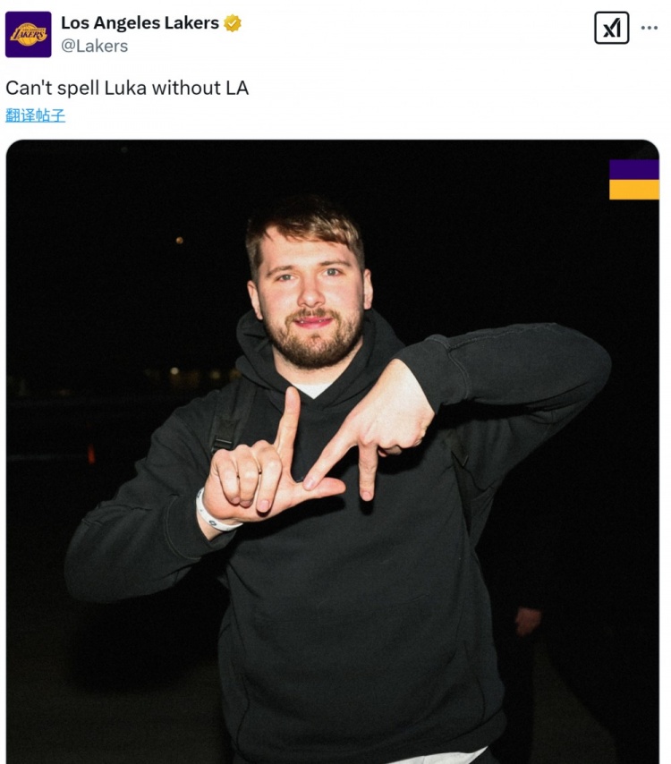 湖人官方曬出了他比“LA(洛杉磯簡(jiǎn)稱)”手勢(shì)的照片,寫(xiě)道:“少了LA(這兩個(gè)字母)是拼不出Luka(盧卡)的?!?/p>