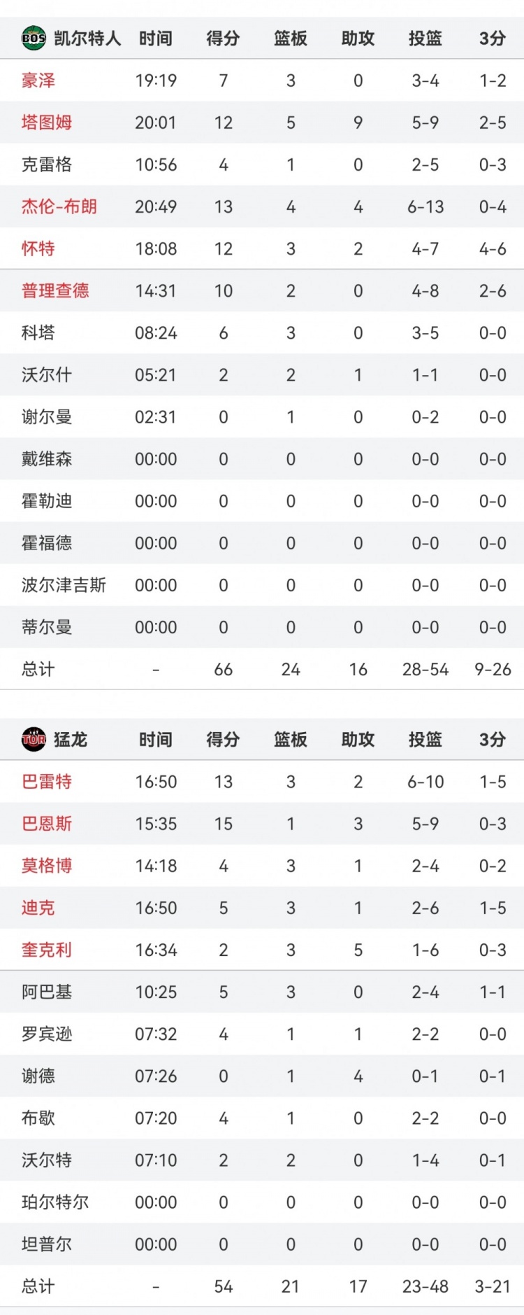 凱爾特人半場66-54領(lǐng)先猛龍12分 全隊(duì)4人得分上雙
