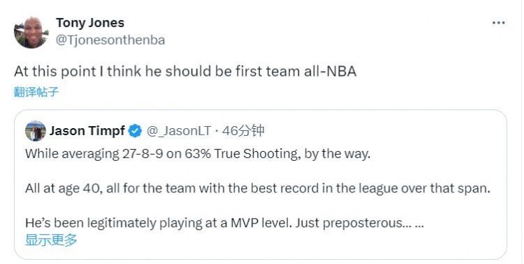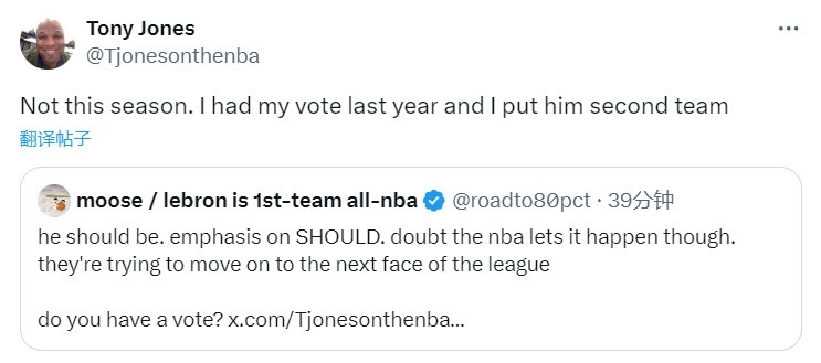 之后,被網(wǎng)友問到有沒有投票權(quán)時,Tony Jones回復(fù):“不是這個賽季。上賽季我有投票權(quán),我把他列在二陣?yán)锩?。?/p>