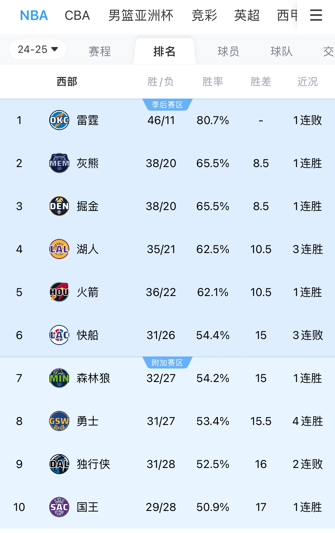 今天的全部比賽結(jié)束后,勇士升至西部第8。