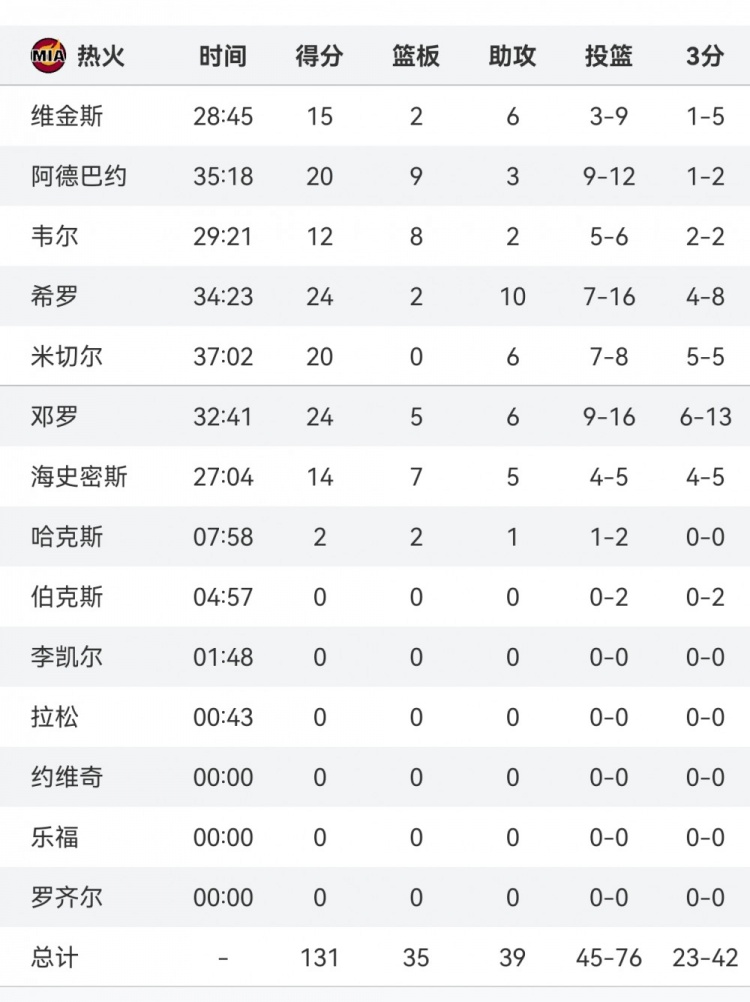 本場比賽,熱火全隊多點開花、共有7人得分上雙、4人得分20+,具體如下:
