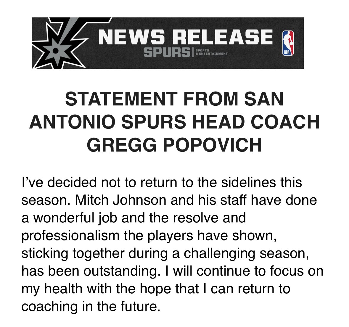 02月28日訊 馬刺官方發(fā)布了波波維奇的一則聲明。