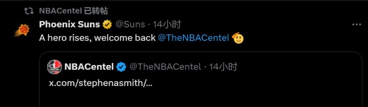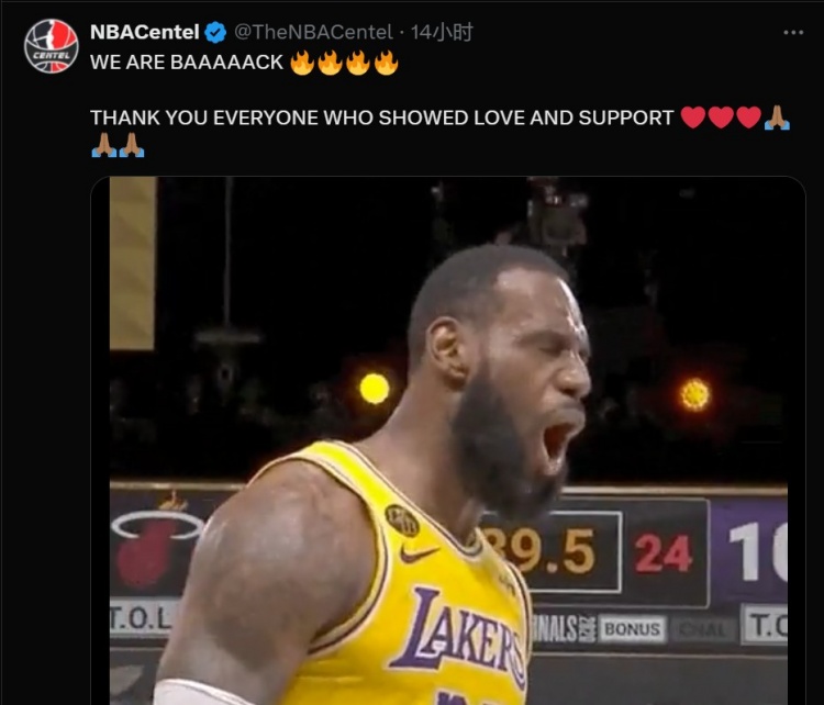 很多賬號都對NBA Centel的回歸感到振奮,活塞、國王、熱火、太陽的官推都向NBA Centel送上了祝賀。