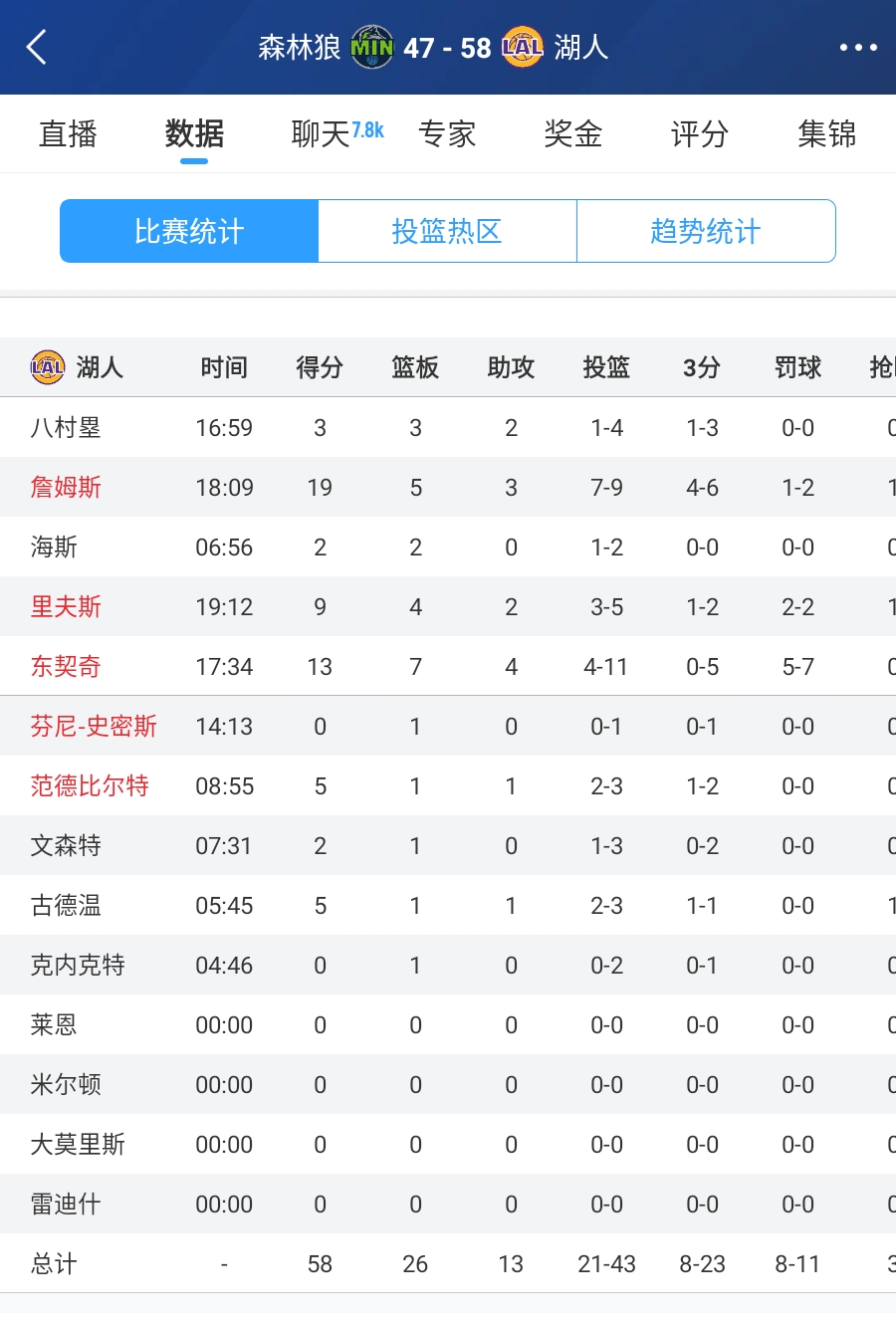 詹姆斯9中7高效19分5板3助 東契奇已筑三雙雛形 湖人半場領(lǐng)先11分