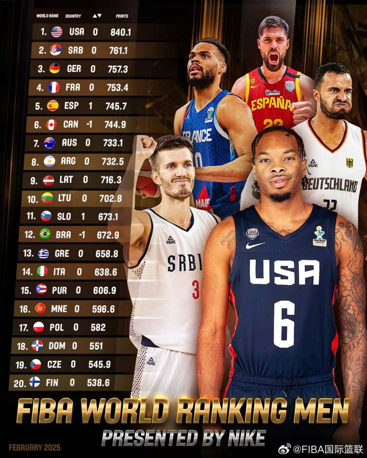 3月1日訊 FIBA官方公布男籃最新世界排名,美國隊穩(wěn)居榜首,中國男籃繼續(xù)排在第30位,亞大區(qū)排名第6。