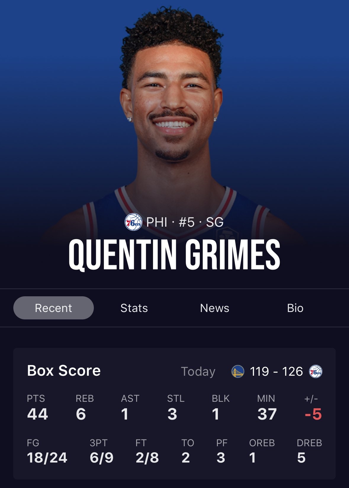 此役,76人后衛(wèi)、獨(dú)行俠舊將格萊姆斯表現(xiàn)神勇,他上場36分43秒24投18中,三分9中6、罰球8中2,砍下44分創(chuàng)生涯新高,還有6籃板1助攻3搶斷1封蓋進(jìn)賬。