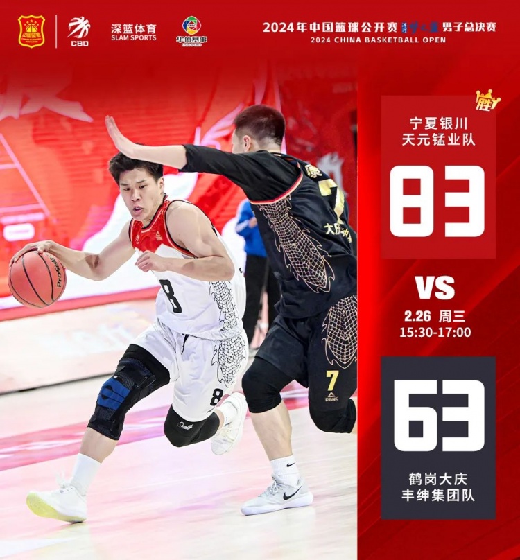 上半場,寧夏天元錳業(yè)一波7-0開局,打停大慶豐紳集團(tuán)。暫?;貋?,寧夏天元錳業(yè)在搶到后場籃板后,積極組織快攻,11-1寧夏天元錳業(yè)領(lǐng)先。隨后大慶豐紳集團(tuán)增強(qiáng)防守,同時(shí)手感開始回暖,但寧夏天元錳業(yè)在前后場籃板和進(jìn)攻上發(fā)揮的更加出色。半場結(jié)束,寧夏天元錳業(yè)44-24大慶豐紳集團(tuán)。下半場,寧夏天元錳業(yè)繼續(xù)保持進(jìn)攻勢頭,最終天元錳業(yè)83-63大慶豐紳集團(tuán)。