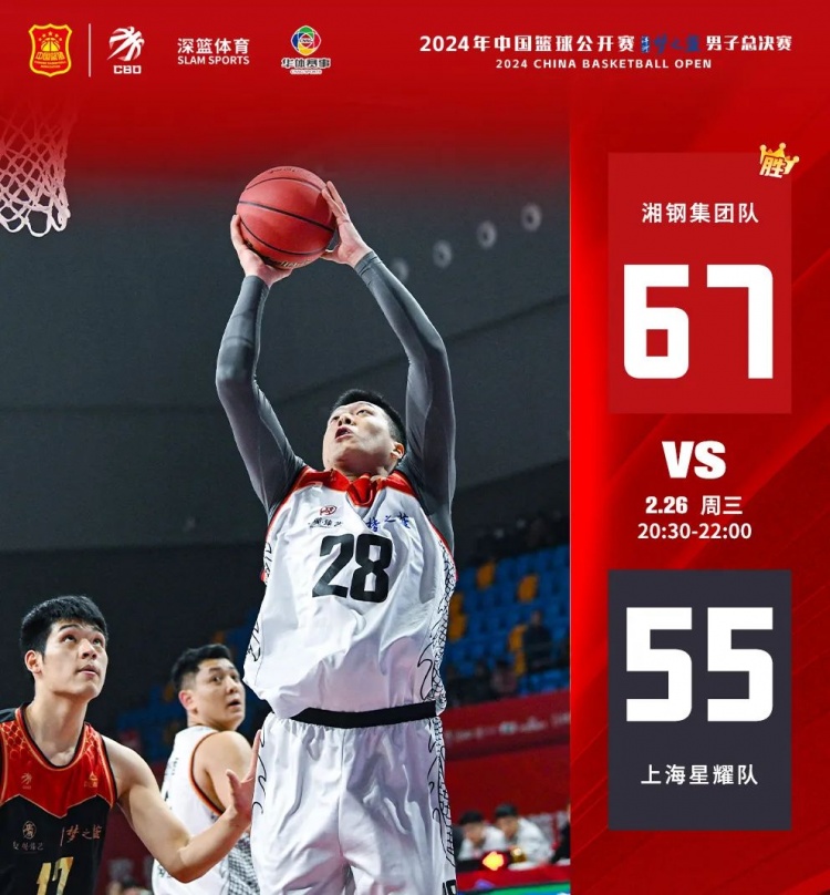 上半場開始,湘鋼集團(tuán)進(jìn)攻十分強(qiáng)勢,取得9-4領(lǐng)先。26號(hào)陳雙、28號(hào)蔡士港相繼投籃命中,上海星耀出現(xiàn)失誤,首節(jié)湘鋼集團(tuán)24-11領(lǐng)先上海星耀。次節(jié),上海星耀加強(qiáng)防守并在籃板的拼搶中更積極主動(dòng)。但湘鋼集團(tuán)沒有給其太多機(jī)會(huì),半場結(jié)束,湘鋼集團(tuán)領(lǐng)先上海星耀16分。下半場,兩隊(duì)沒有拉開太大分差,依靠上半場的領(lǐng)先優(yōu)勢,湘鋼集團(tuán)以67-55戰(zhàn)勝上海星耀。