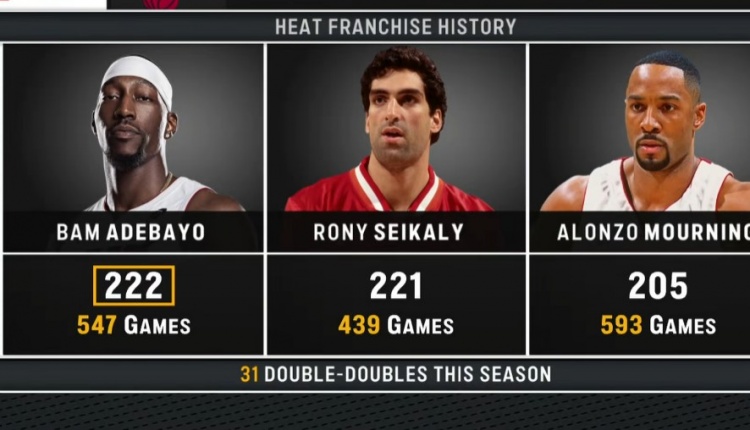 值得一提的是,今天阿德巴約拿到了生涯第222次兩雙,他超越羅尼-塞卡利,加冕熱火隊史兩雙王。