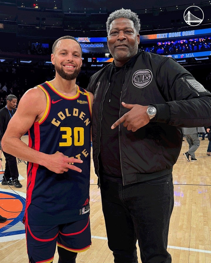 賽后,勇士官推曬出了一張庫里和名宿“大媽”拉里-約翰遜的合影,后者是庫里父親戴爾-庫里黃蜂時(shí)期的隊(duì)友。