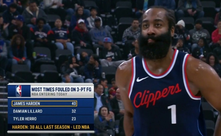 本場比賽之前,快船后衛(wèi)哈登保持著自己在外線的殺傷力,40次三分被犯規(guī)領(lǐng)跑全聯(lián)盟。
