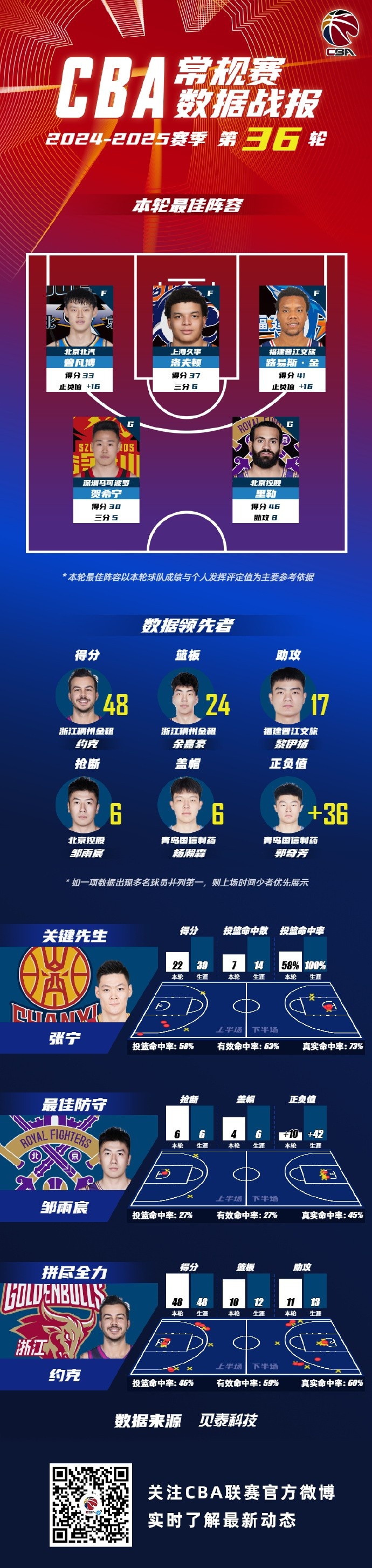 數(shù)據(jù)領(lǐng)先者方面:浙江稠州籃球俱樂部球員約克以單場(chǎng)48分的數(shù)據(jù)領(lǐng)銜得分榜;
