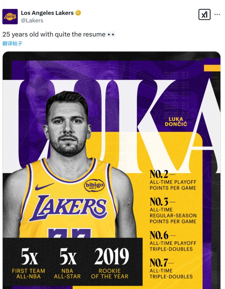 25歲!湖人曬東契奇履歷:5次一陣&5次全明星 季后賽場(chǎng)均30.9分