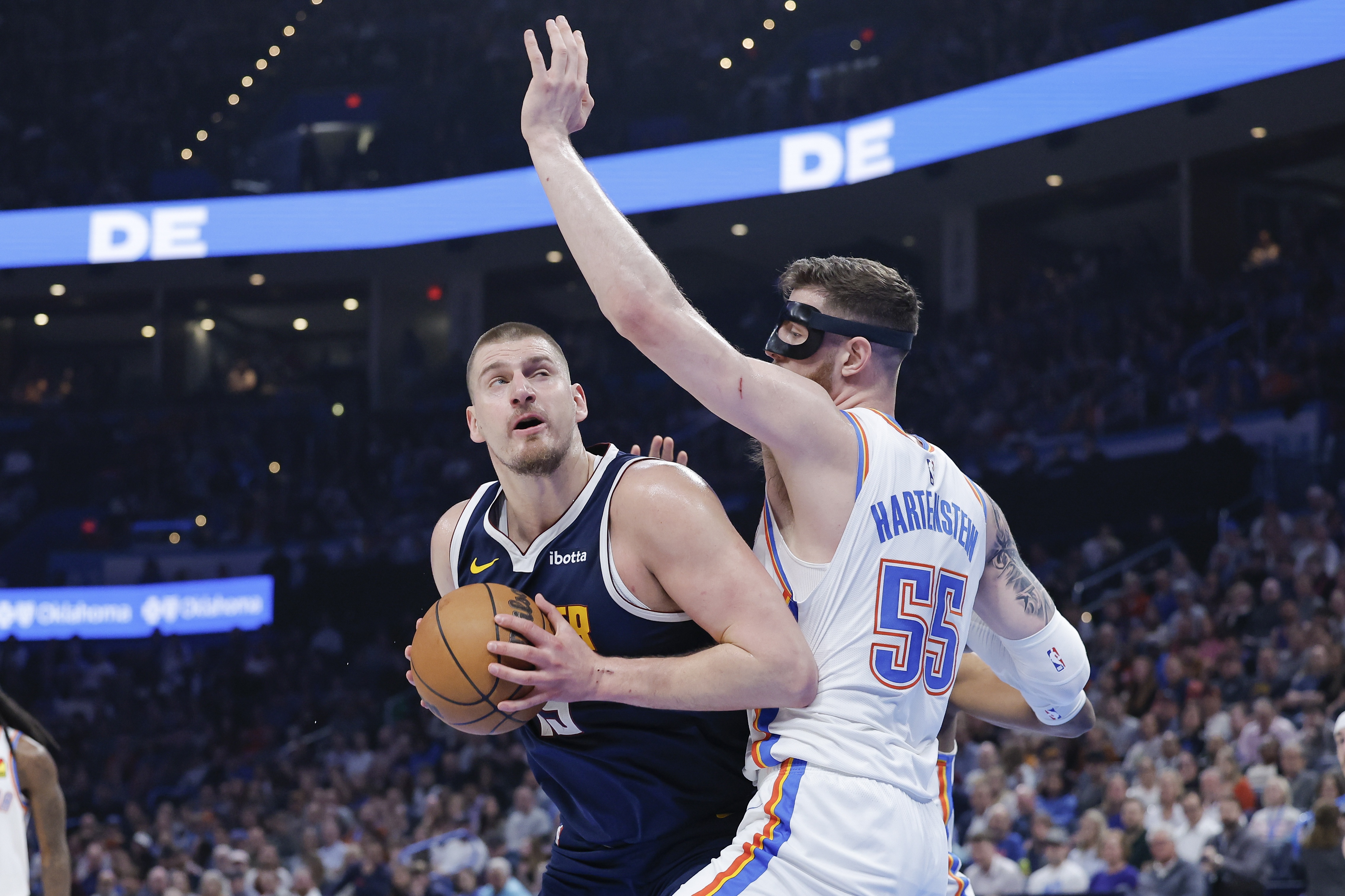 雷霆防守的底層邏輯是哈爾滕施泰因當(dāng)肉盾正面扛約老師,其他人幫忙夾擊輪轉(zhuǎn),首發(fā)陣容優(yōu)先放空威少、替補(bǔ)陣容優(yōu)先放空沃特森。戴格諾特教練允許掘金的半射手在三分線外抽獎(jiǎng),局部2-3協(xié)防不讓約老師舒服地單打強(qiáng)吃——雷霆防守效率聯(lián)盟第一,小個(gè)球員能把輪轉(zhuǎn)速率和防守伸縮性拉滿,這是他們制衡約老師的根本底氣。