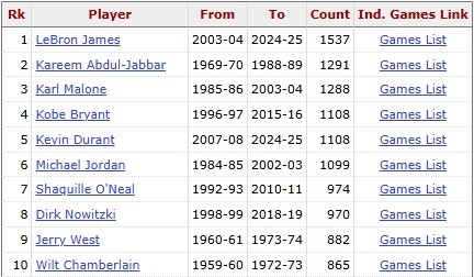這是杜蘭特生涯(常規(guī)賽+季后賽)第1109場(chǎng)單場(chǎng)20+,超越科比,獨(dú)居歷史第四,僅次于詹姆斯(1537)、賈巴爾(1291)和卡爾-馬龍(1288)。