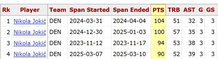 據(jù)統(tǒng)計(jì),約基奇在連續(xù)3場(chǎng)比賽中至少得到90分50籃板30助攻,自聯(lián)盟合并以來唯一,而且他生涯已經(jīng)是第4次做到這一點(diǎn)。
