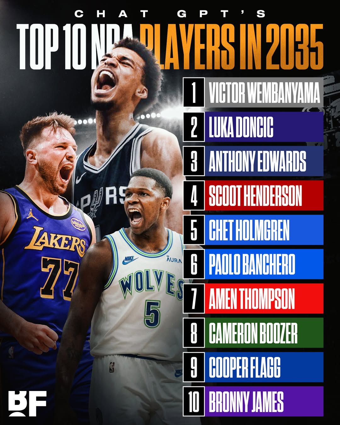 ChatGpt預(yù)測十年后前十球員:文班第一 東契奇第二 布朗尼第10