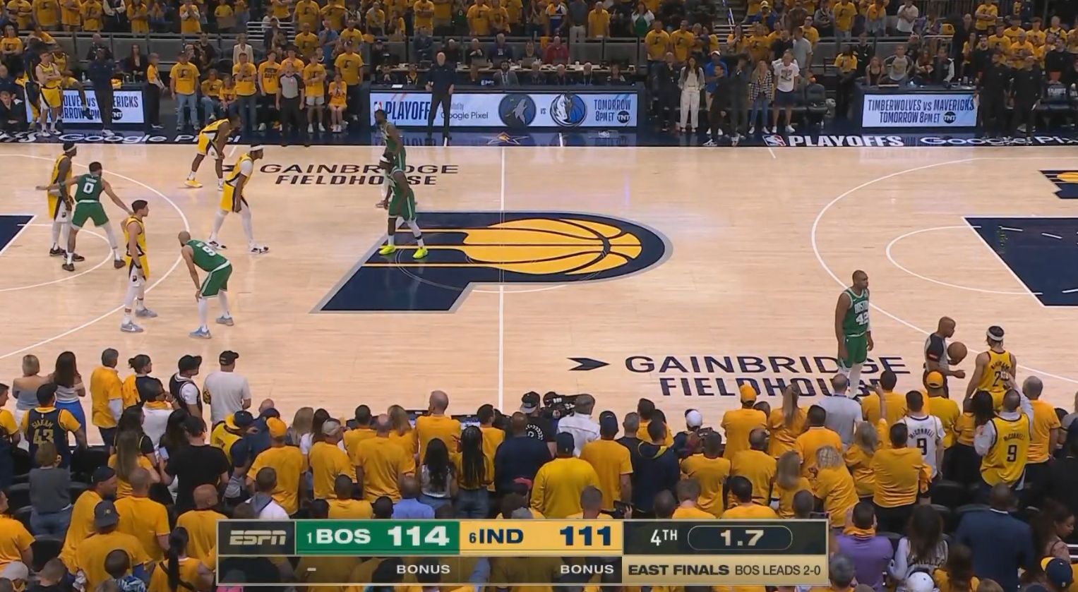值得一提的是,上賽季步行者面對凱爾特人(東部決賽G3)曾使用這個(gè)戰(zhàn)術(shù),當(dāng)時(shí)比分都一樣,而且發(fā)球人也是同一個(gè)(安德魯-內(nèi)姆哈德),不過最后內(nèi)史密斯的絕平三分球沒投進(jìn)。