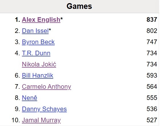 這是約基奇代表掘金出戰(zhàn)的第735場(chǎng)比賽,超越T.R-鄧恩,上升至隊(duì)史第四。