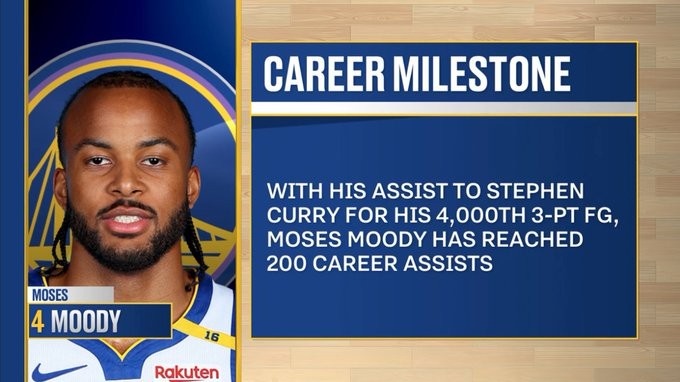 比賽第三節(jié),穆迪助攻庫里命中本場第2記三分,后者正式突破4000記三分神級大關,而這也是穆迪生涯的第200次助攻!