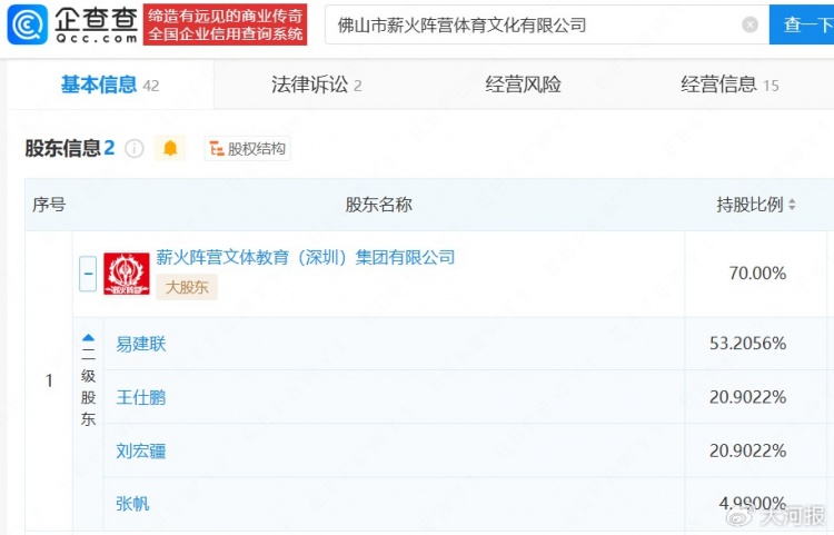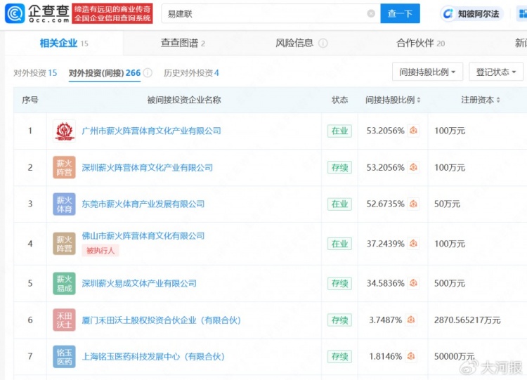 企查查APP顯示,易建聯(lián)關(guān)聯(lián)15家企業(yè),其中12家為存續(xù)狀態(tài),包括薪火陣營文體教育(深圳)集團有限公司、上海壹球成名信息技術(shù)有限公司等。此外,易建聯(lián)間接持股企業(yè)超200家,行業(yè)涉及除體育文化外,還包括商貿(mào)、科技、投資等領(lǐng)域。今年2月,易建聯(lián)關(guān)聯(lián)企業(yè)佛山市薪火陣營體育文化有限公司成被執(zhí)行人,執(zhí)行標的約12萬元。