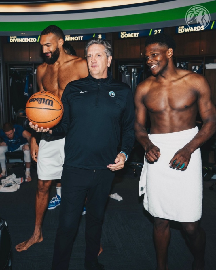 賽后全隊在更衣室為芬奇慶祝,后者也拿到了比賽用球。愛德華茲和戈貝爾更是僅僅裹著一條浴巾就和芬奇合影,老將英格爾斯也擁抱送上祝賀。