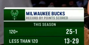 本賽季雄鹿得分120+的比賽25勝1負(fù) 得分少于120分的比賽13勝29負(fù)