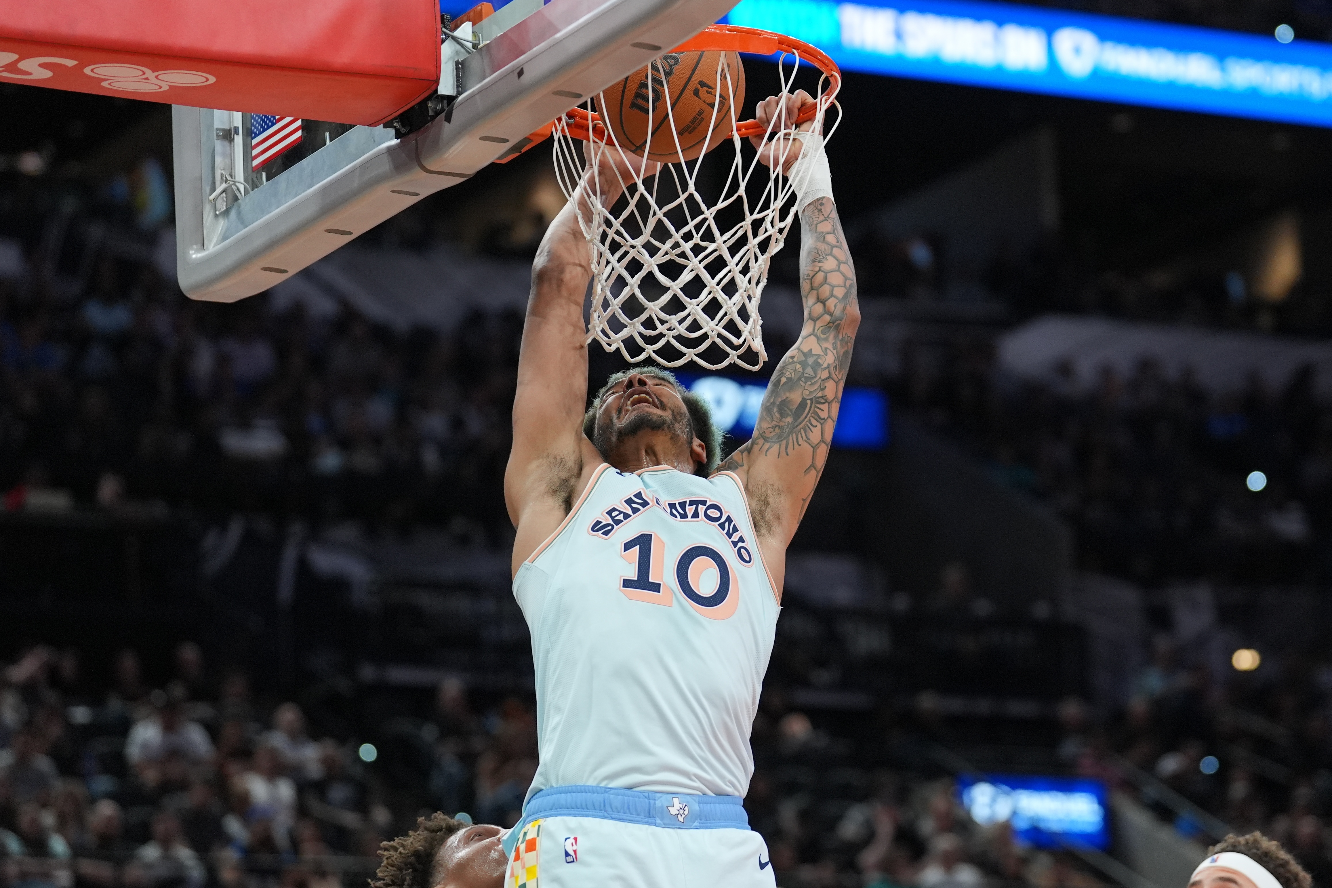 馬刺球員索漢本場(chǎng)比賽打得不錯(cuò),他在場(chǎng)上依舊活力滿滿,不僅拼搶籃板積極,還有上演空接暴扣的精彩表現(xiàn)。