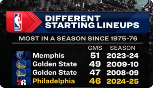 傷兵滿營(yíng)!76人本賽季70場(chǎng)比賽排出46套首發(fā) 49年來(lái)歷史第四多