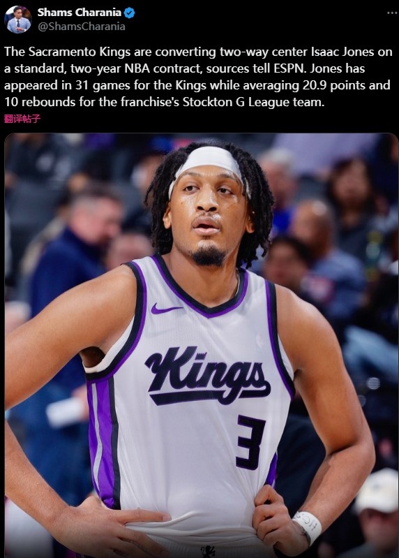 3月23日訊 今日,據ESPN著名記者Shams Charania報道,據消息人士向透露,國王將與雙向中鋒艾薩克-瓊斯簽訂一份為期兩年的標準NBA合同。
