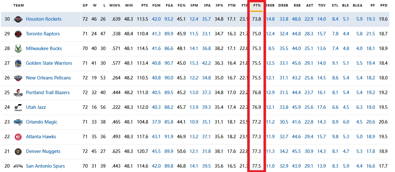 賽季至今,火箭場(chǎng)均23.1次罰球,命中率僅有73.8%,聯(lián)盟倒數(shù)第一。
