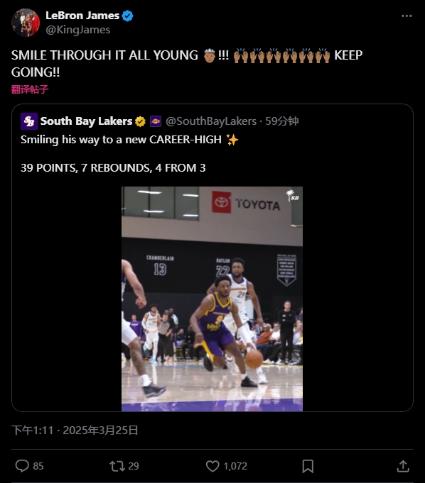 賽后,詹姆斯轉(zhuǎn)發(fā)了布朗尼的賽場集錦并寫道:“保持微笑,繼續(xù)前進,年輕的王子!加油!”