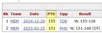 據統(tǒng)計,162分是本賽季球隊單場得分的新高,此前紀錄是灰熊的155分。2024年12月27日,灰熊155-126大勝猛龍。