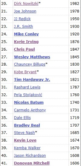 而在現(xiàn)役球員中,米切爾則排在第20,排在他前面的是樂福的1674記。