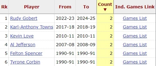 據(jù)統(tǒng)計,這是戈貝爾到森林狼后第3次單場10+進攻籃板,升至隊史第一。