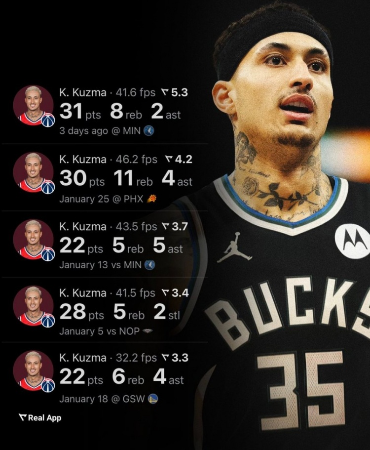 據(jù)統(tǒng)計,本賽季當庫茲馬出戰(zhàn)時間大于30分鐘時(13場比賽),他場均能得到21.7分6.4籃板2.4三分,投籃命中率45.4%,三分命中率36%。