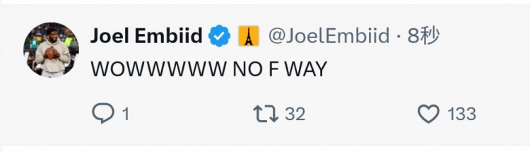 恩比德發(fā)推寫(xiě)道:“哇哦.... 臥槽不會(huì)吧?!?/p>