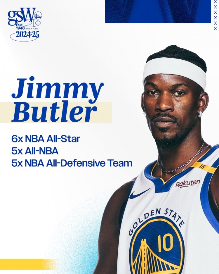 勇士官方也曬出照片歡迎巴特勒,并羅列了巴特勒的個人榮譽:6屆全明星、5次入選最佳陣容、5次入選最佳防守陣容。