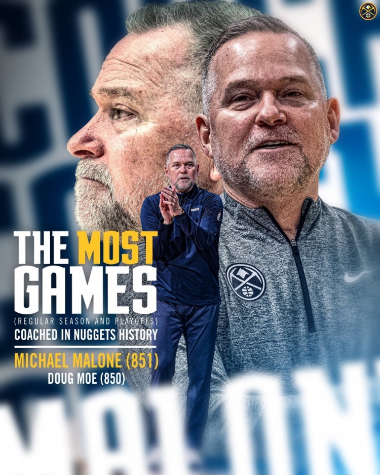 今天掘金官方更推顯示,主帥邁克-馬龍執(zhí)教場(chǎng)數(shù)來(lái)到了851場(chǎng)(常規(guī)賽+季后賽),超越道格-莫(850場(chǎng))升至掘金隊(duì)史第一。