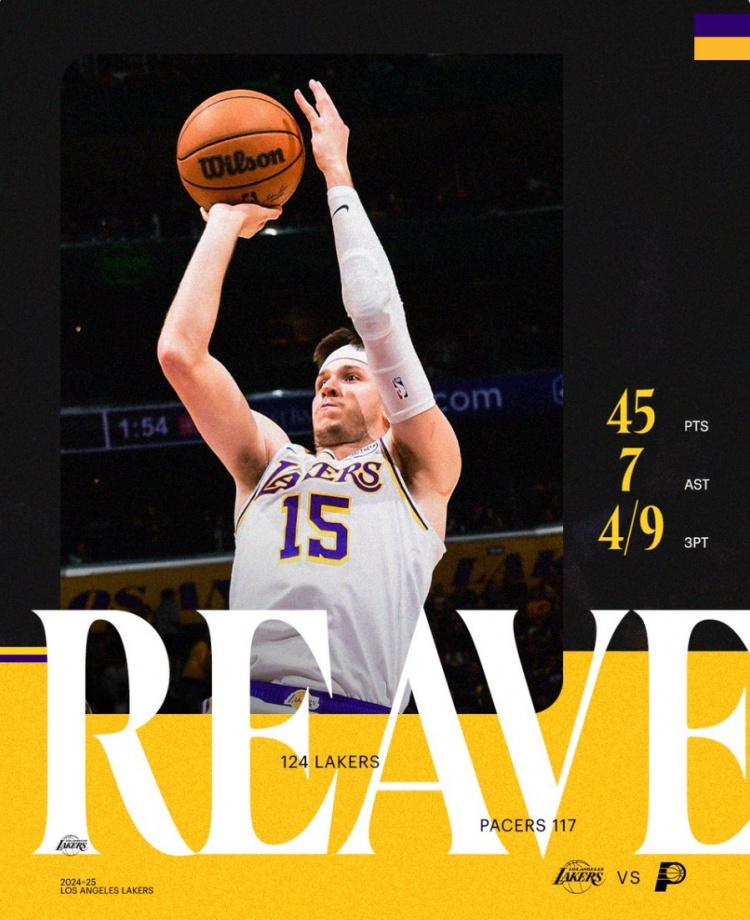 賽后,湖人官方曬出了贏球海報(bào),里夫斯榮登封面。