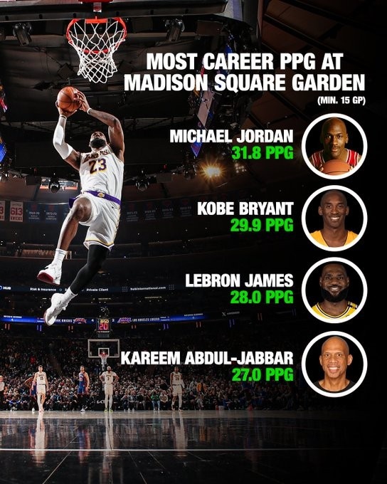 麥迪遜廣場(chǎng)花園生涯得分:?jiǎn)痰?1.8分居首 科比2詹姆斯3賈巴爾4